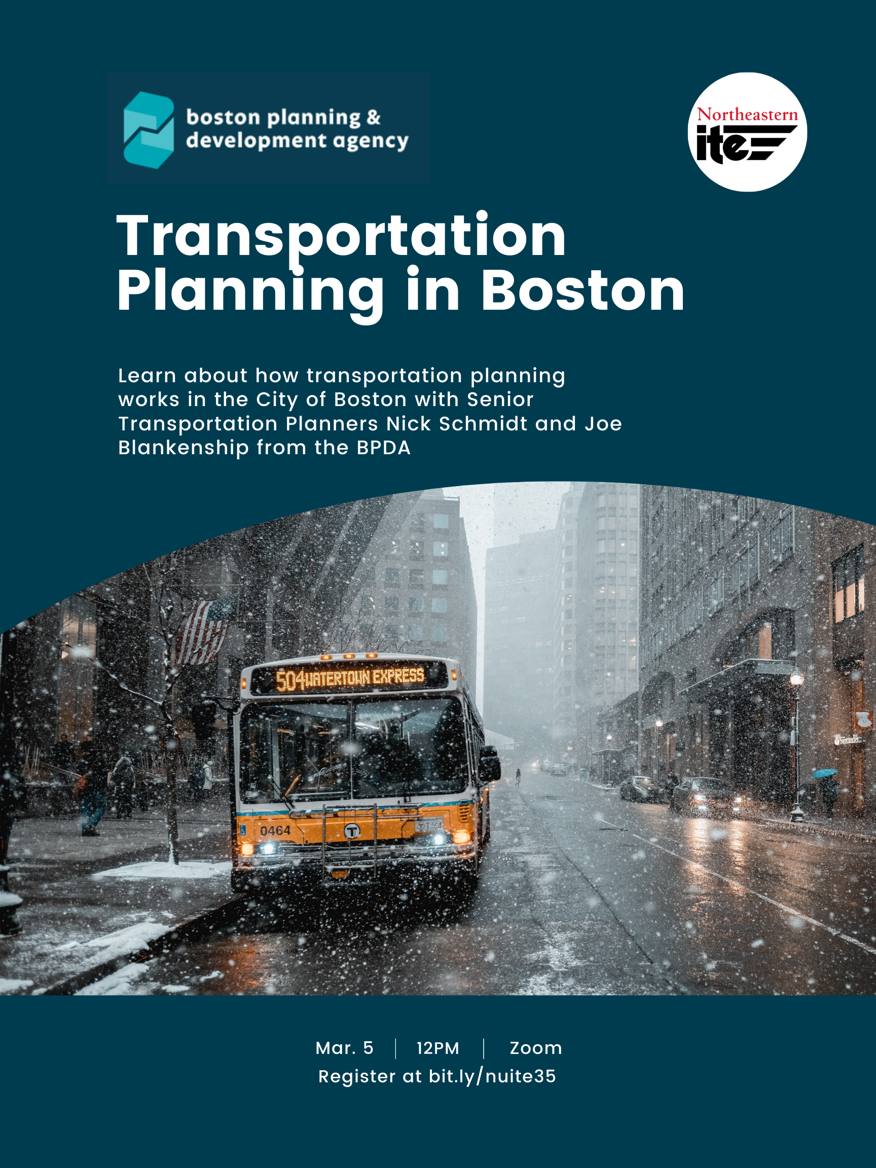 Join NU ITE for a presentation and Q&A with Nick Schmidt, AICP and Joe Blankenship, two Senior Transportation Planners at the Boston Planning & Development Agency (BPDA), the city agency responsible for neighborhood & transportation planning and approving all large developments in the city. Nick and Joe oversee major transportation plans and projects throughout the city, and are involved in permitting new developments, ensuring they align with the city transportation vision. Please pre-register at: https://northeastern.zoom.us/meeting/register/tJIocuqtqD0sGtSEkwQL6rXf5KIWe7obDRsR