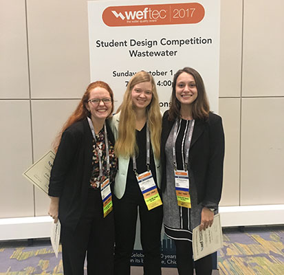 Recent CEE alums Catherine Moskos, Erika Towne and Lindsey Carver competed at the National Water Environment Federation student design competition in Chicago this past October during the the Water Environment Federation’s Technical Exhibition and Conference, which is the largest annual water quality event in the world.