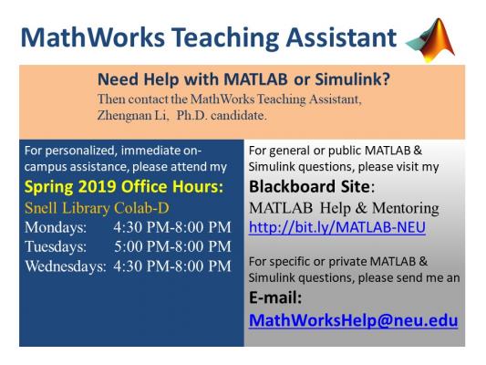 Mathworks TA office hours for Spring 2019: Mondays: 4:30 pm – 8:00 pm Tuesdays: 5:00 pm – 8:00 pm Wednesdays: 4:30 pm – 8:00 pm in Snell Library Colab-D
