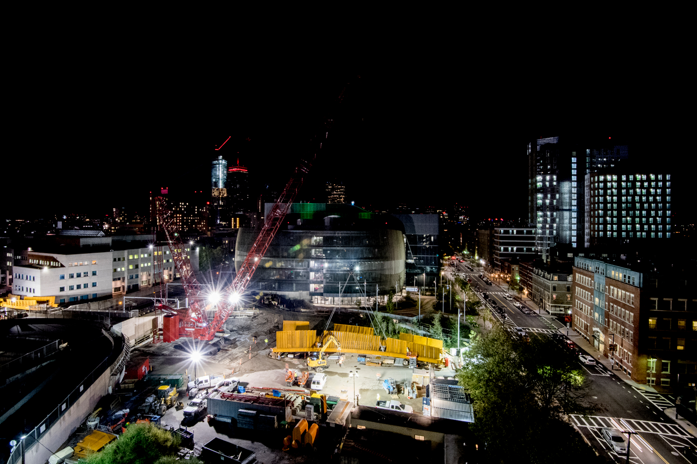 Early in the morning of October 14th, Northeastern hosted a Midnight Masters Class prior to the installation of a 132-foot long section of the Pedestrian Crossing bridge that will link to two sides of the Northeastern campus over the MBTA tracks.