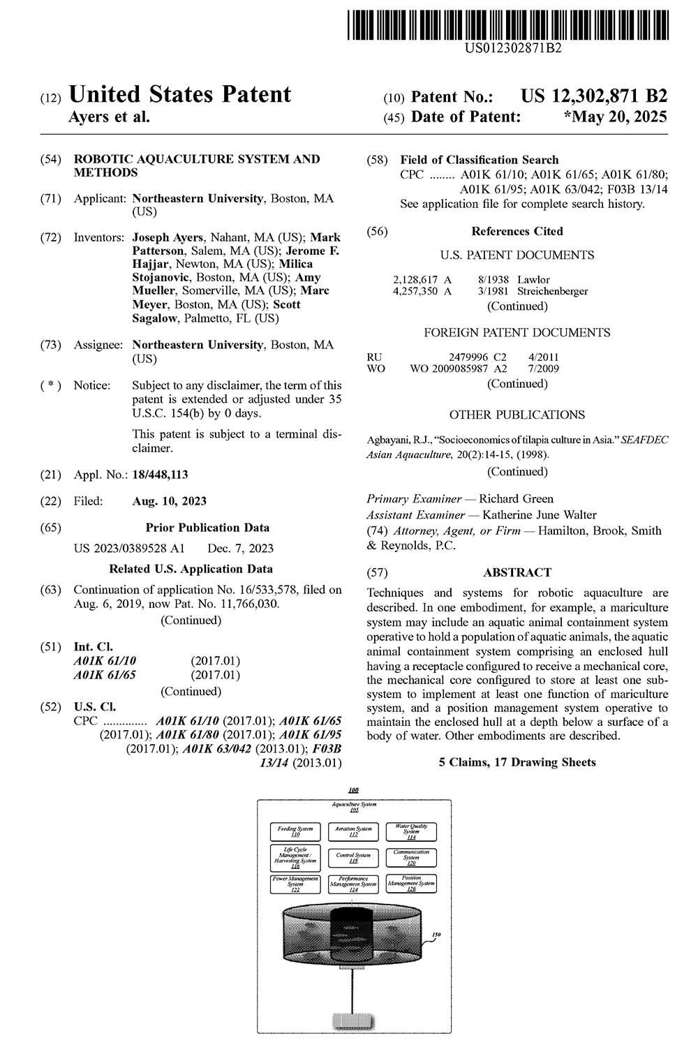 BioE/ECE Affiliated Faculty Joseph Ayers, MES/CEE Professor Mark Patterson, CEE University Distinguished and CDM Smith Professor Jerome Hajjar, ECE Professor Milica Stojanovic, and CEE/MES Associate Professor Amy Mueller were awarded a patent for “Robotic aquaculture system and methods.”